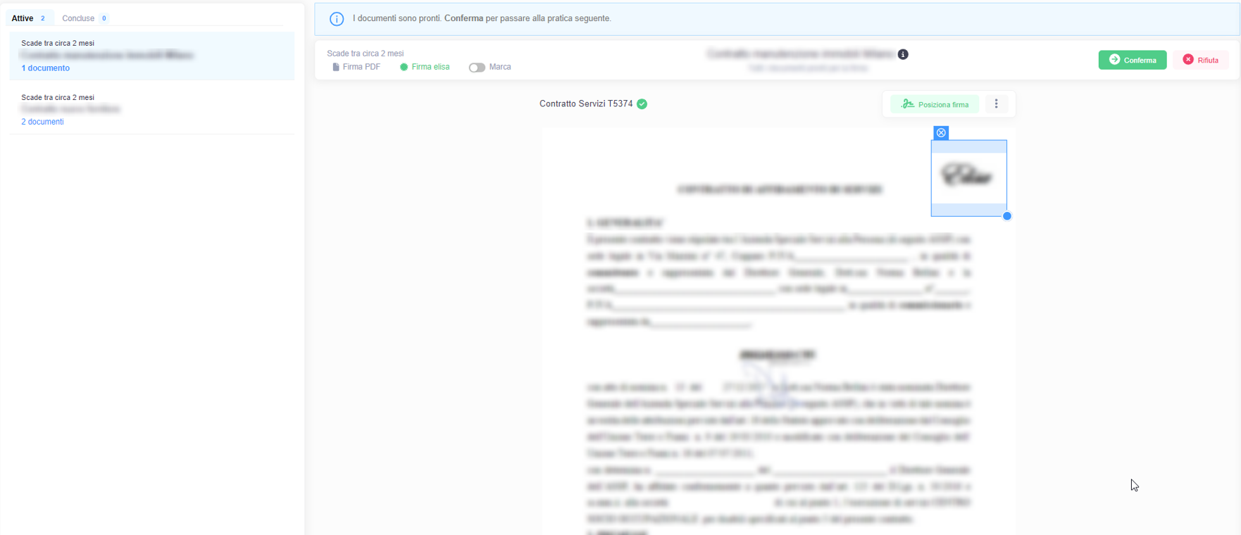 A destra solo elencate le pratiche attive, cioè le pratiche che devi firmare e quelle concluse, cioè pratiche firmate che hanno terminato il loro ciclo di lavorazione.