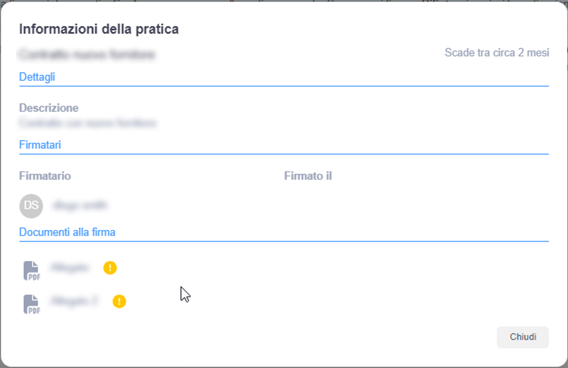 Yubik mostra informazioni aggiuntive della pratica, gli utenti che hanno approvato la pratica e le date di aprovazione, l'elenco dei firmatari e lo stato delle loro firme, i documenti da firmare e i documenti allegati alla pratica.