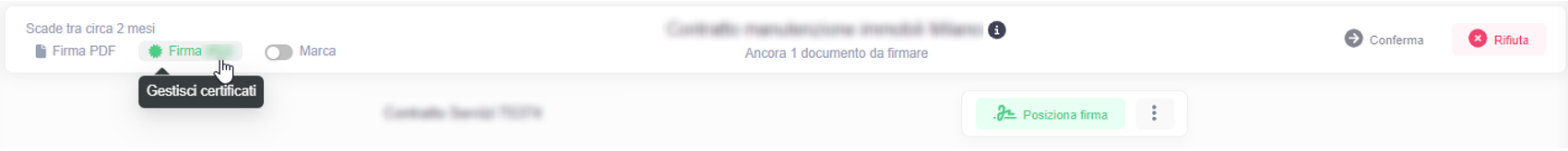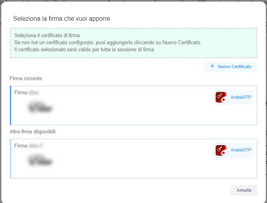 Se hai configurato più di un certificato compatibile con il tipo firma previsto per la pratica, puoi scegliere quello da usare cliccando sul nome del certificato che stai utilizzando.