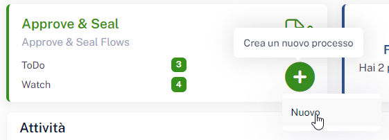 Per creare una nuova pratica clicca sul “+” nel riquadro “Approve & Sign” e poi su nuovo.