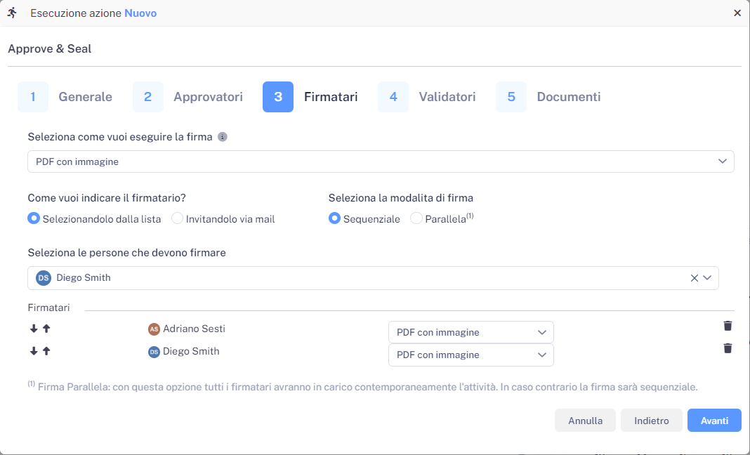 Per ogni firmatario puoi scegliere una tipologia di firma diversa, Yubik verificherà che le tipologie scelte non pregiudichino la validità del documento. - Seleziona la modalità di firma: Se vengono selezionati due o più firmatari è possibile indicare se la firma deve avvenire in sequenza oppure in parallelo.