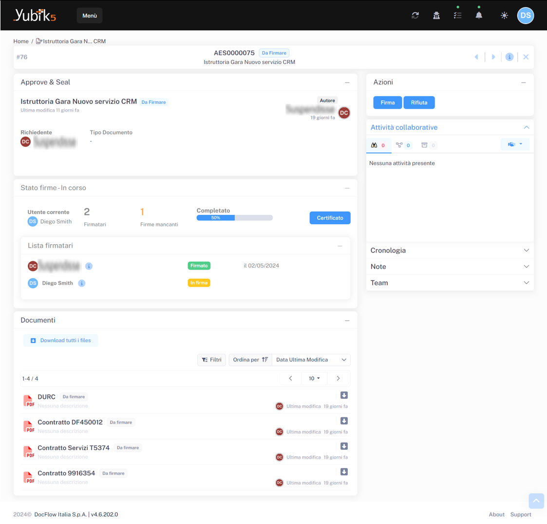Puoi rifiutare la firma dei documenti attraverso l'azione “Rifiuta”, Yubik ti chiederà di compilare una nota obbligatoria per giustificare il rifiuto.